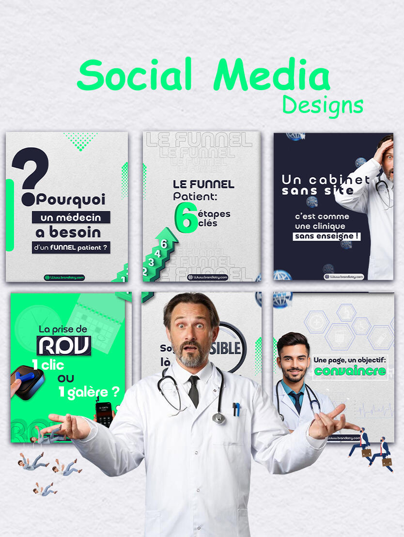 Creative social media designs developed for Brandiatry Santé, a marketing agency specialized in digital communication for doctors and healthcare professionals. The project focuses on delivering medical content through modern, engaging visuals while maintaining a consistent and professional brand presence across social media platforms.